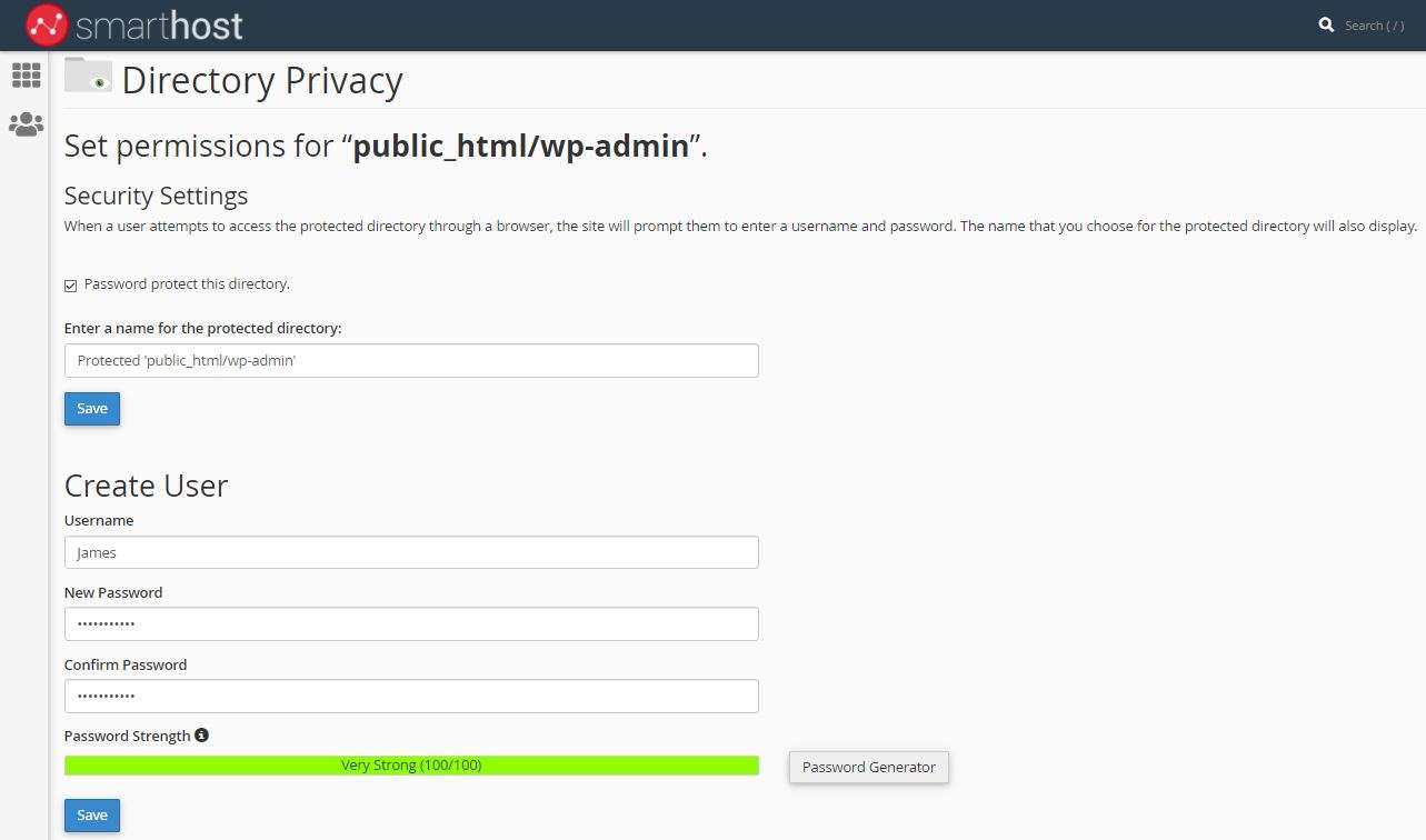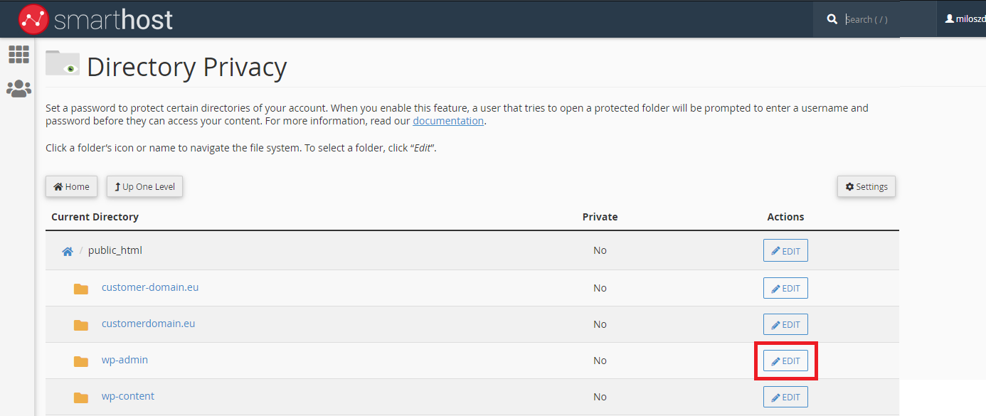Next, click the edit button next to the desired directory and complete the form. The first step is to select the checkbox "Password protect this directory", then enter any name for the protected directory and press save. Later, we only create the user and enter the password, which we will use additionally to log in and click save.