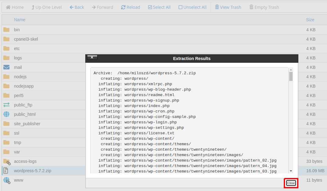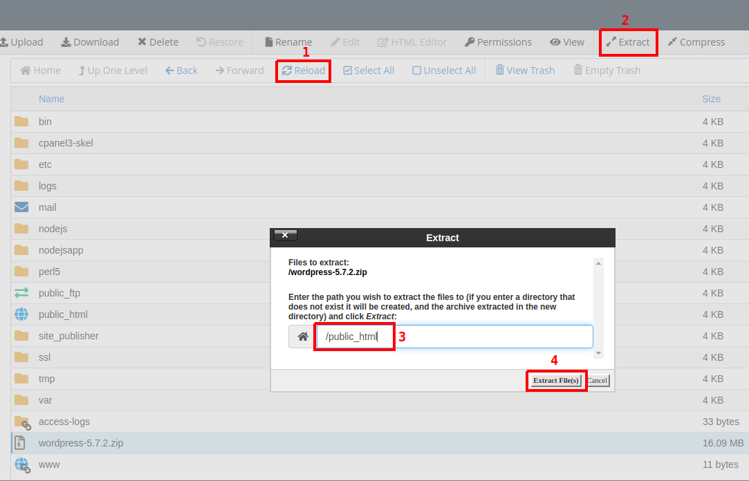 After placing the file on the server, click the "Reload" button (field 1) to refresh the view of our files. Click once on the "wordpress" file (marked in blue) and then on the "Extract" button (field 2) to extract it on the server.