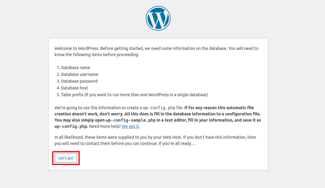After entering the address, if everything was successful, we should see a screen informing us about the need to set up access to the database, on which we should click the "Let's go" button.