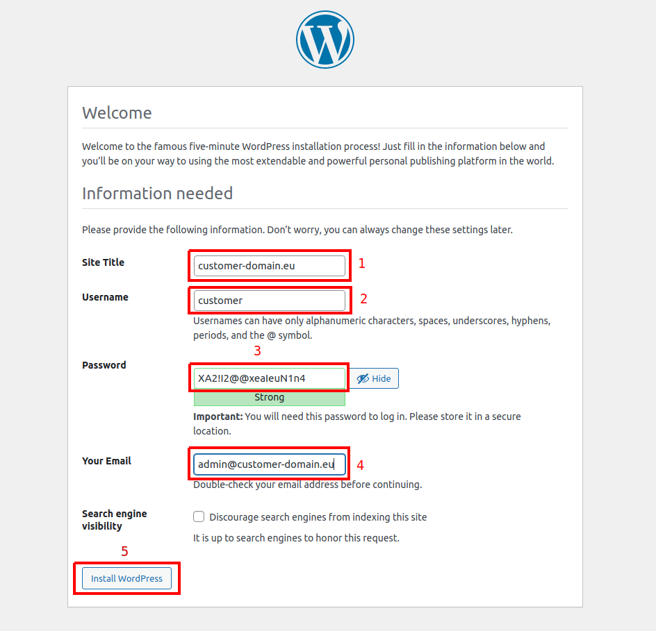After completing the configuration of access to the database, we will be greeted by the welcome screen of the WordPress installation, where we must provide all the necessary data for configuration.