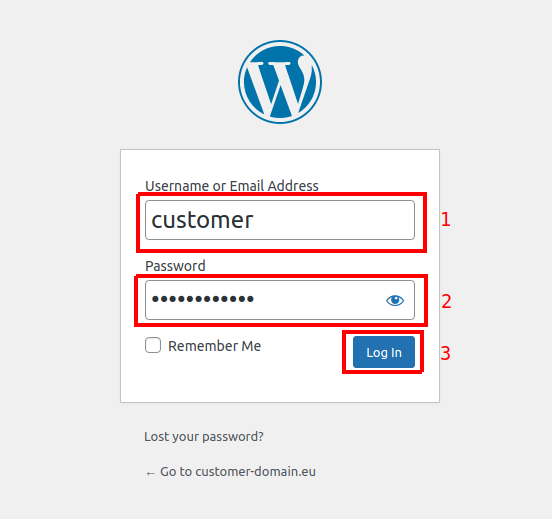 On the login screen, enter our username (field 1) and password (field 2), which we entered on the welcome screen of the WordPress installation. Then select the "Log in" button (box 3).