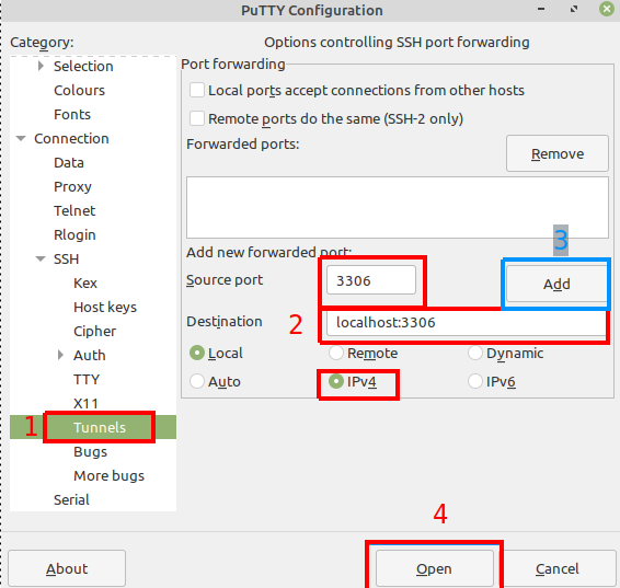 From the menu on the left, expand SSH by clicking the square with +. Additional options are developing from which we select Tunnels. Enter the values as in the picture below, select IPv4 and click Add. At the end, we click Open (we can also go to the initial Session screen and save our settings).
